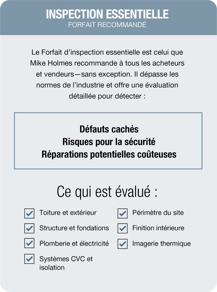 Une inspection immobilière réalisée par Mike Holmes offre aux acheteurs et vendeurs potentiels une évaluation précise et impartiale de l’état de la maison qu’ils envisagent de vendre ou d’acheter. Cette inspection consiste en un examen approfondi des principaux systèmes de votre habitation, vous permettant ainsi de prendre des décisions éclairées lors d’une transaction immobilière.